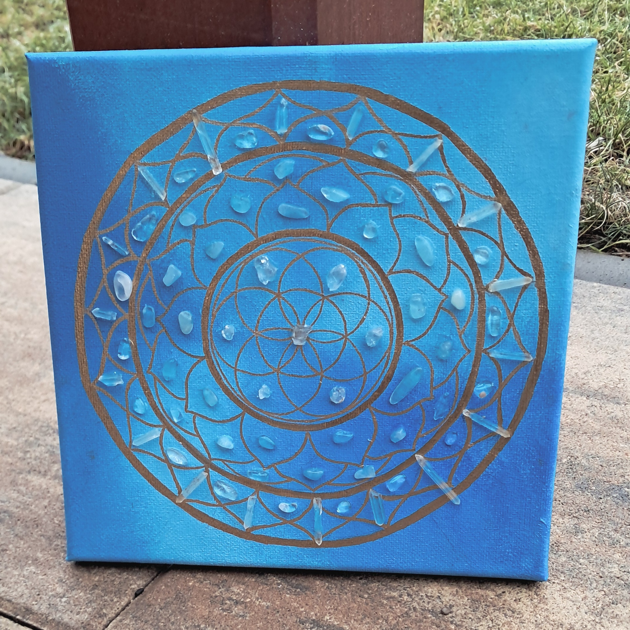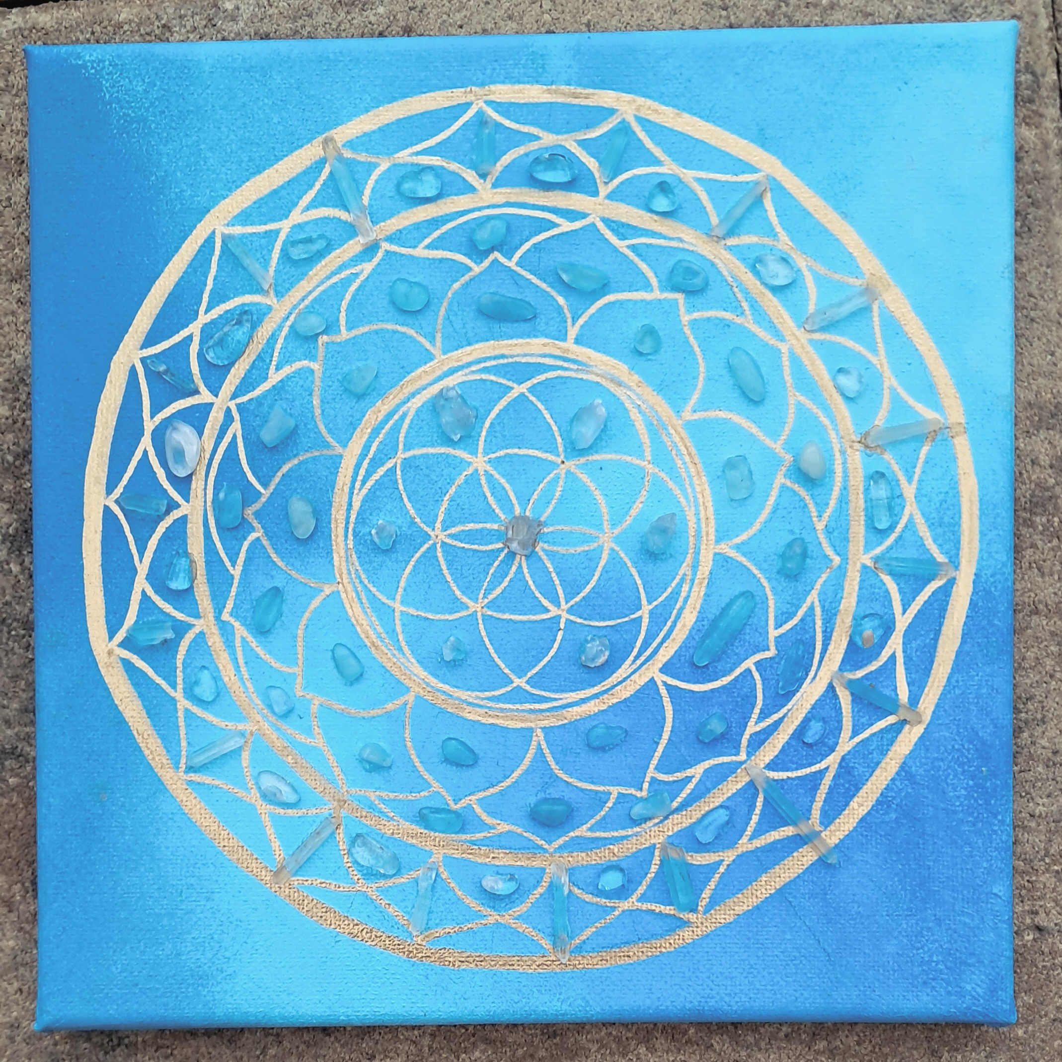Krystalová mřížka SPOJENÍ S DUŠÍ s celestýny, akvamaríny a kříšťály 20 x 20 cm (Kopírovat)