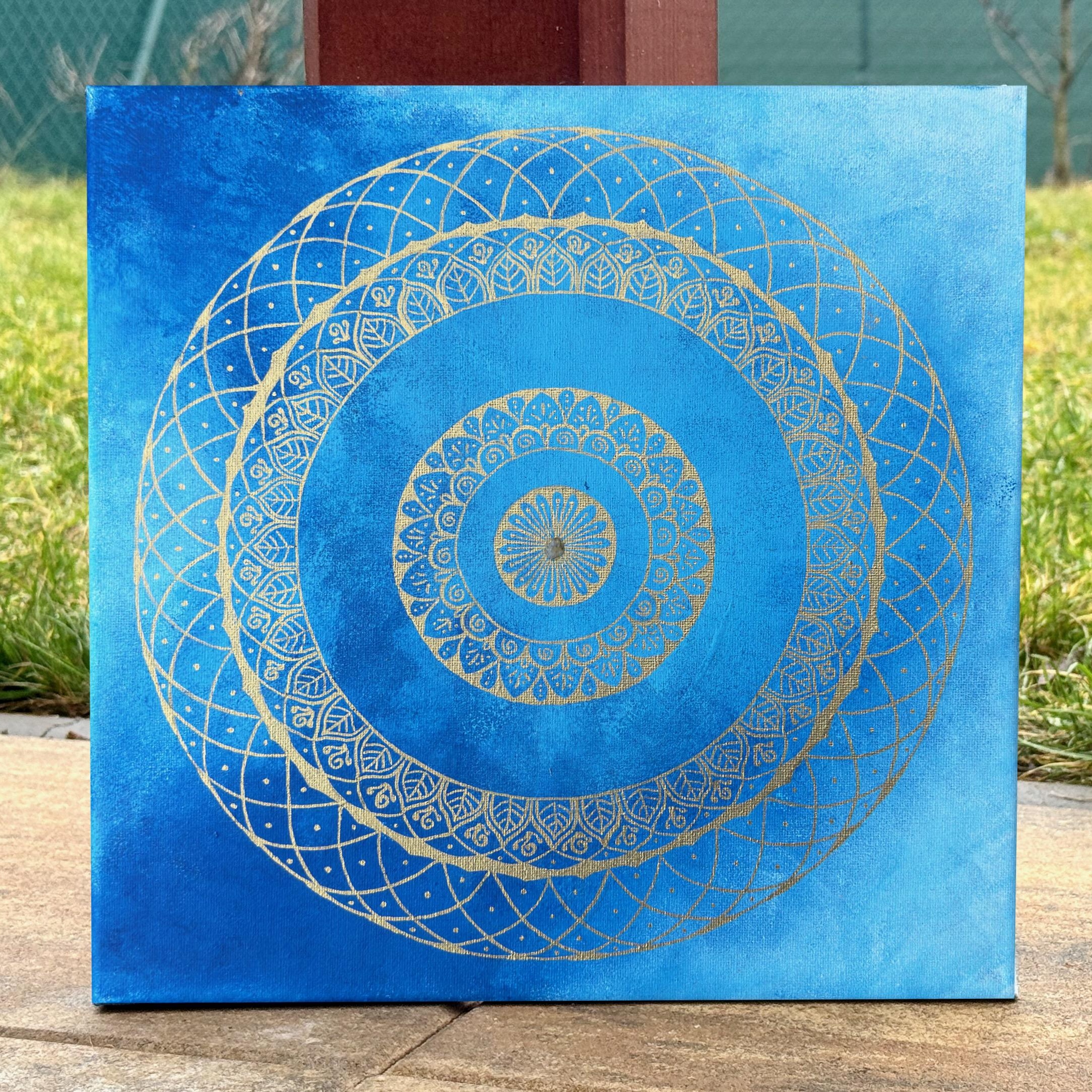 Mandala malovaná akrylovými barvami a zlatou lakovou fixou, uprostřed je připevněný malý křišťálek